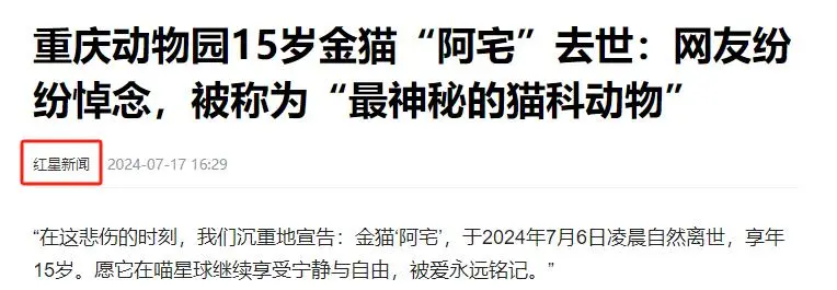 红星新闻《重庆动物园15岁金猫“阿宅”去世:网友纷纷悼念,被称为“最神秘的猫科动物”》,2024-7-17