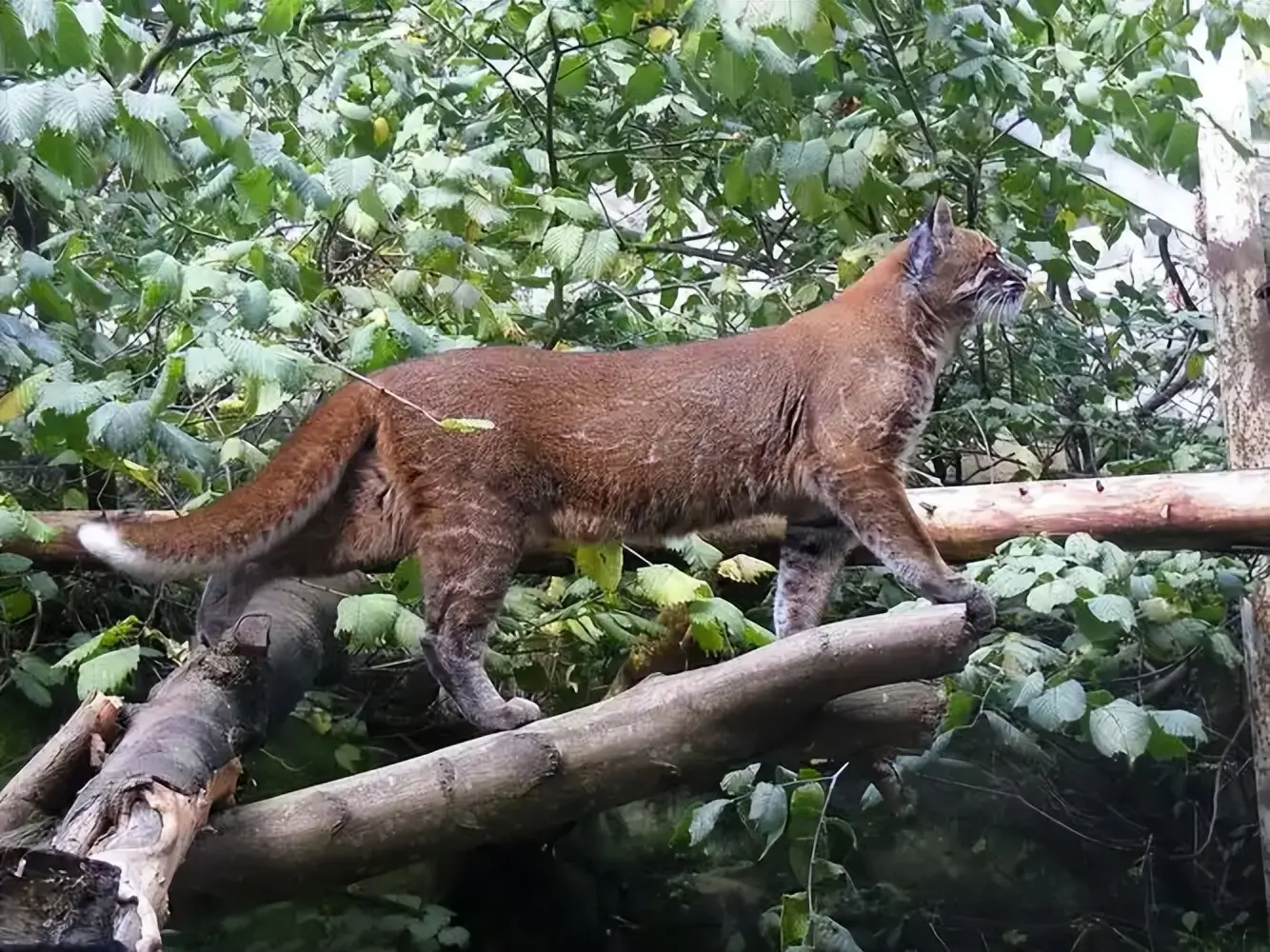 金猫拥有强大的肌肉力量和灵活的四肢,既能在地面快速奔跑,也能熟练攀爬树木,适应复杂地形,它的耐力和瞬间爆发力使其成为森林中高效的捕猎者。